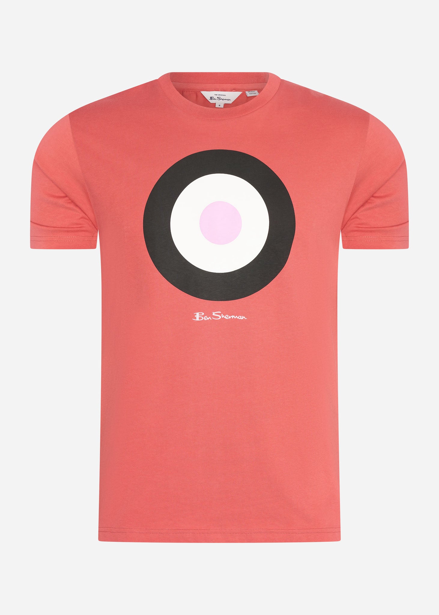 The Signature target tee by Ben Sherman is a t-shirt that will make you feel bold and lively. This t-shirt is made from 100% organic jersey cotton, which is smooth, breathable, and good for the environment. The raspberry color is a bright and cheerful hue that will catch everyone’s eye. The t-shirt has a crewneck and a regular fit, and a target logo print on the chest that displays your fashion sense. This t-shirt is machine-washable and easy to style. You can combine it with any bottoms, from jeans to chinos, and look fun and fashionable. Get this signature tee by Ben Sherman now.