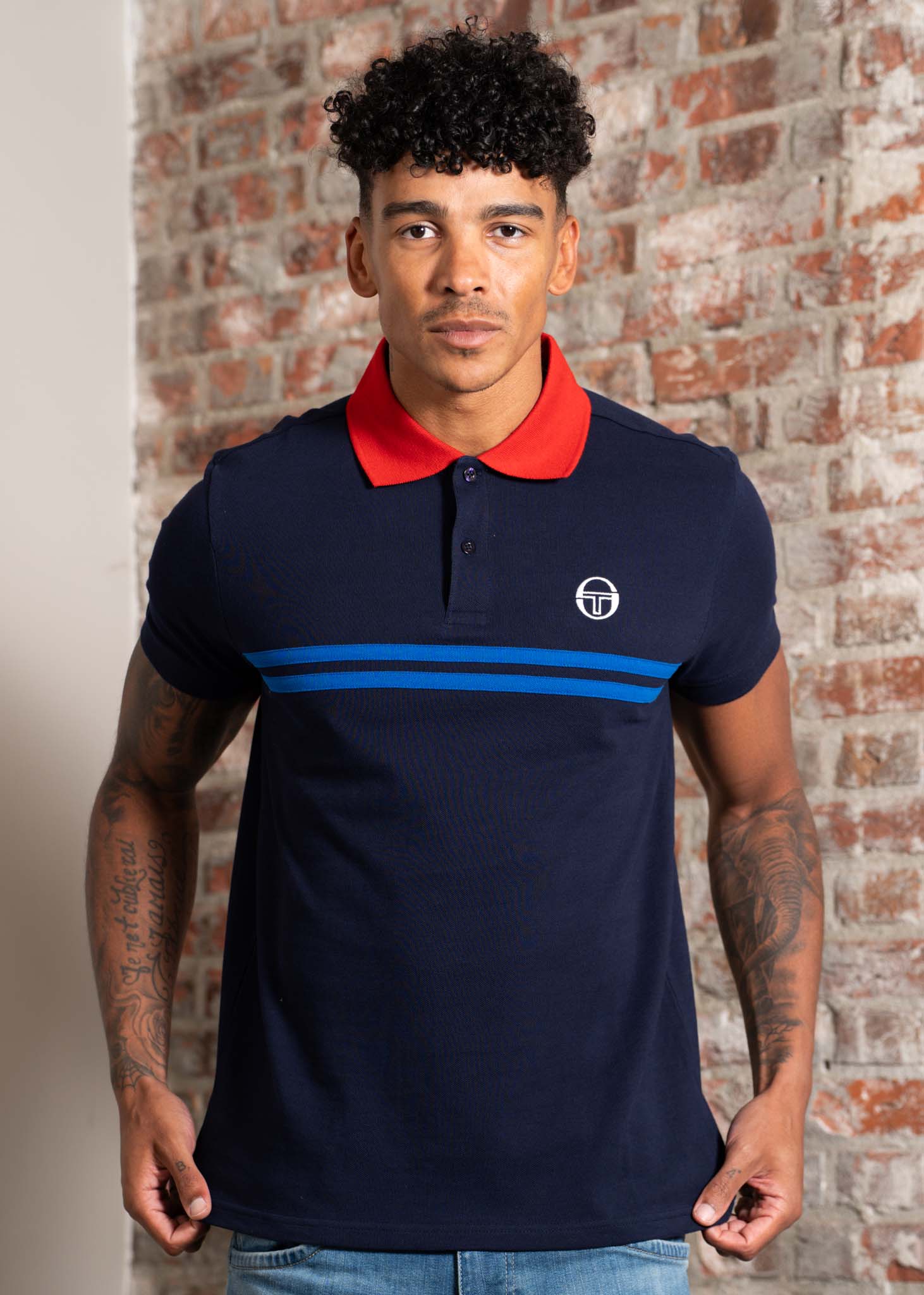 Dit sportieve poloshirt heeft twee gekleurde borststrepen en contrasterende ribgebreide ronde hals en manchetten. Het is afgewerkt met het geborduurde logo.