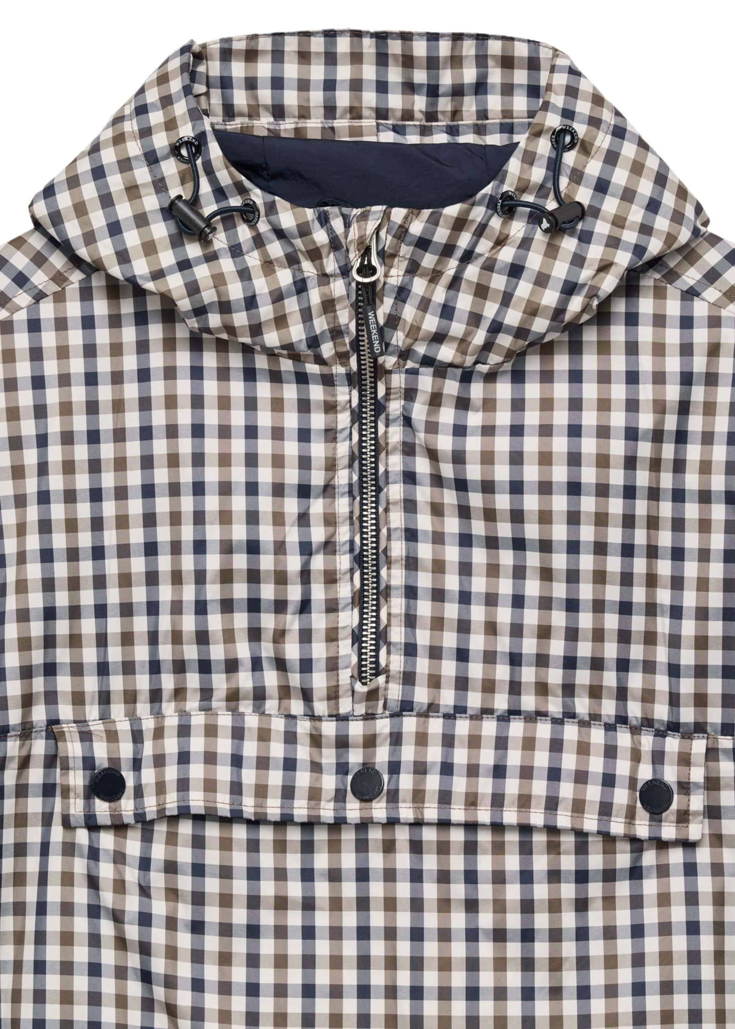 Statement overhead jacket gemaakt van ons iconische 100% polyester 3-kleurige fijne geweven mid house check. De jas is vervaardigd uit onze WO onmiskenbare lichte, hoogdichte geweven 100% nylon parachutestof met een licht reflecterend oppervlak. Alle stoffen zijn behandeld met een extra DWR (Durable Water Repellent) coating voor betere bescherming tegen het weer.