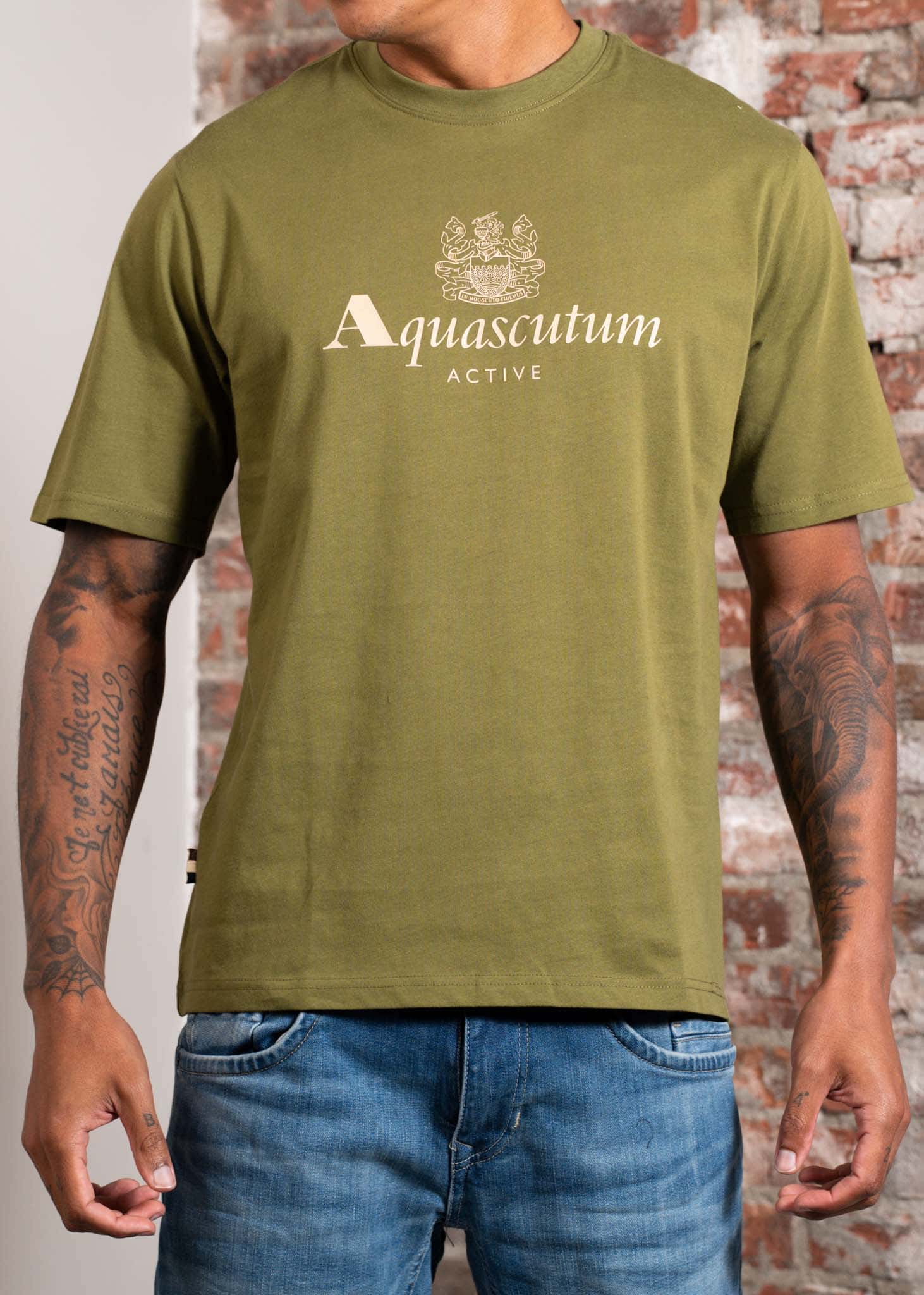 Statement piece van het Britse heritage merk Aquascutum. Dit T-shirt heeft een oversized plastisol logoprint op de borst en is gemaakt van 100% katoen in een comfortabele regular/loose fit. Tijdloos, clean en direct herkenbaar.