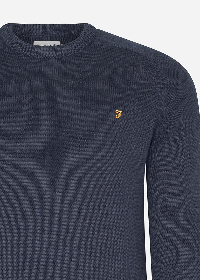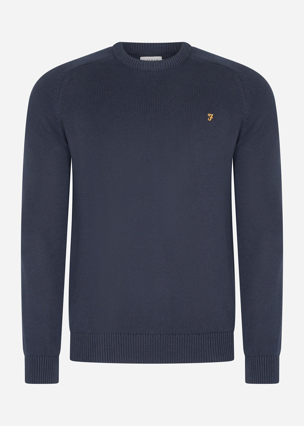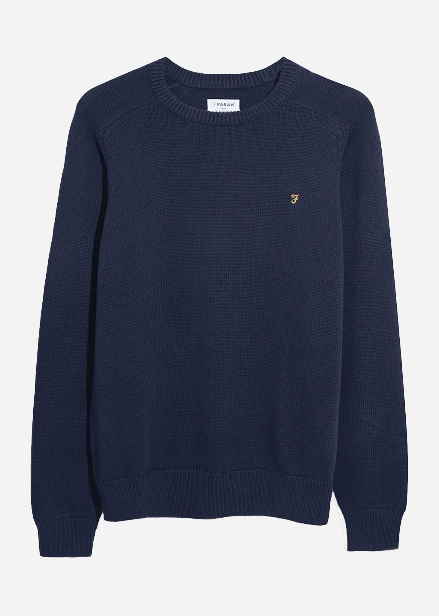 De Farah Kingsbury Crew Neck Sweater combineert stijl en comfort dankzij het gebruik van premium biologisch katoen en een tijdloos design. Dit slanke, fijn gebreide trui biedt een verfijnde look met subtiele details, zoals de geborduurde gouden 'F' branding en ribgebreide afwerking, perfect voor zowel casual als formele gelegenheden.