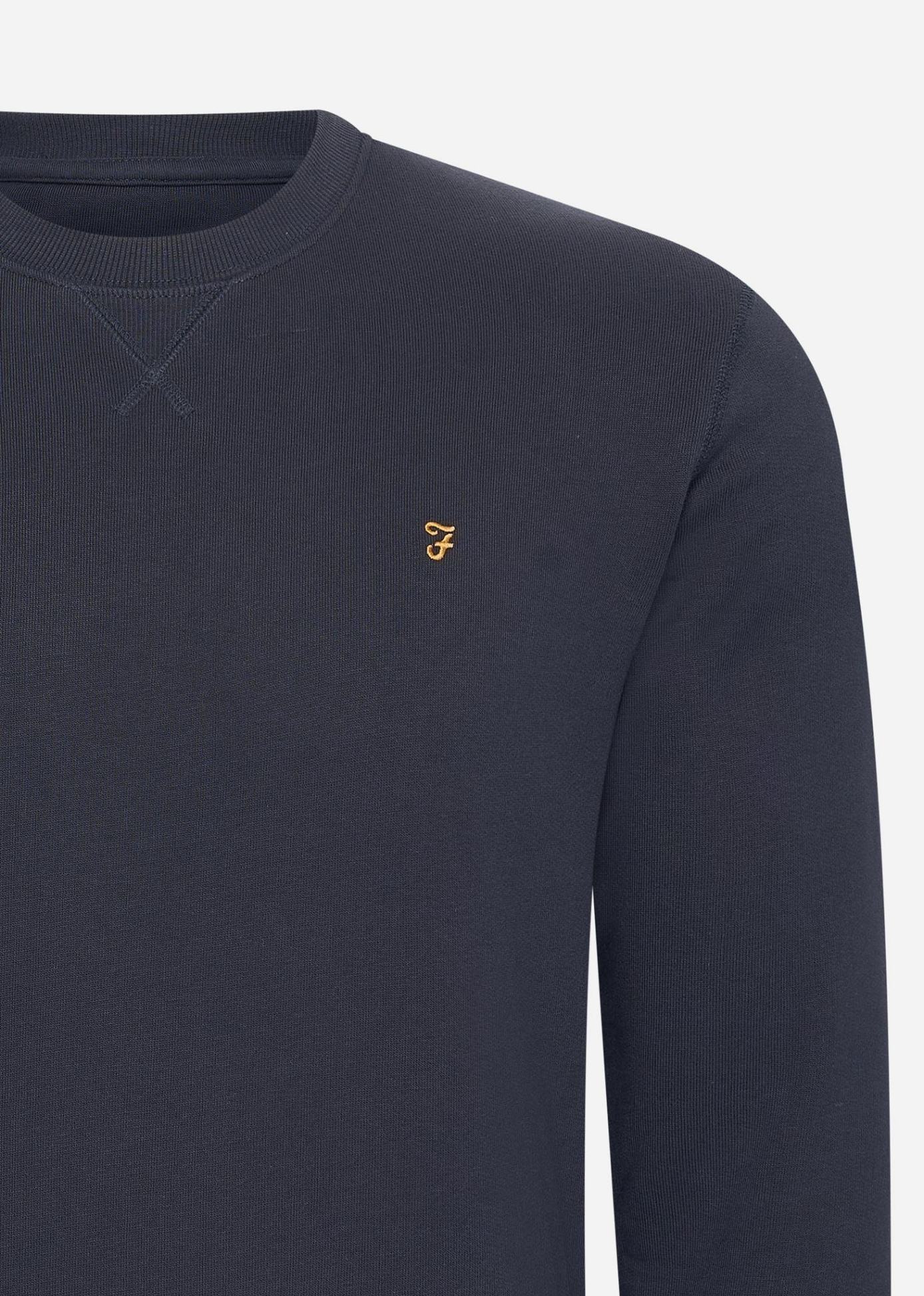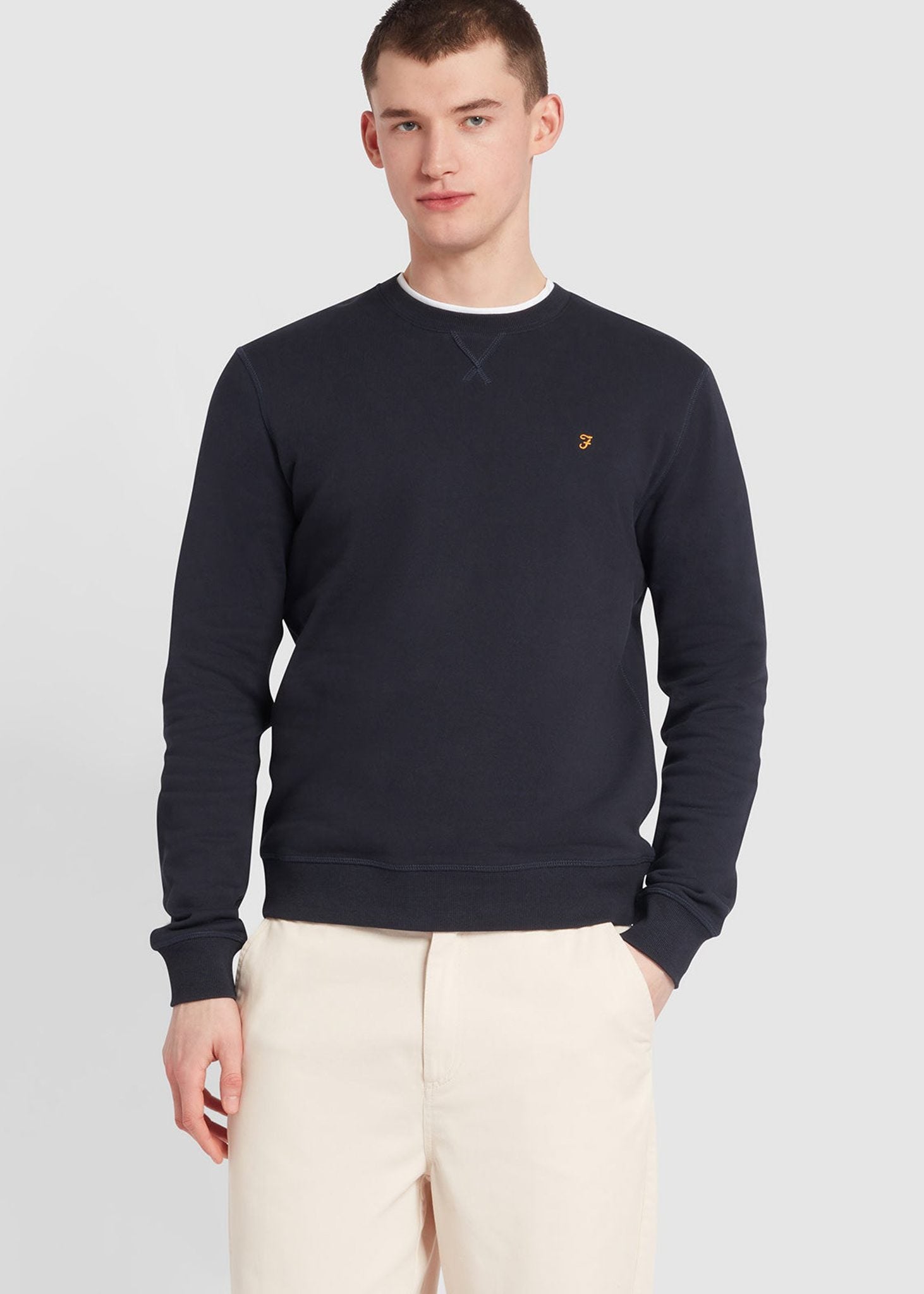 De Farah Tim sweater is een slim-fit trui met lange mouwen en een ronde hals, verkrijgbaar in een reeks tijdloze kleuren en gemaakt van 100% biologisch katoen. Details zijn onder andere een geribbelde kraag, zoom en manchetten, en ons kenmerkende gouden Farah-logo op de linkerborst.