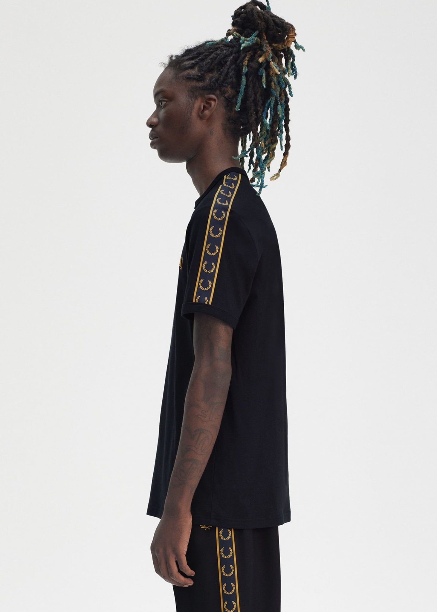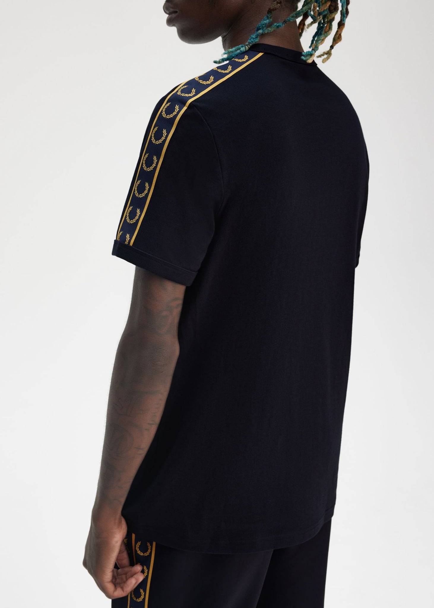 - Branded Laurel Wreath tape op schouder en mouw