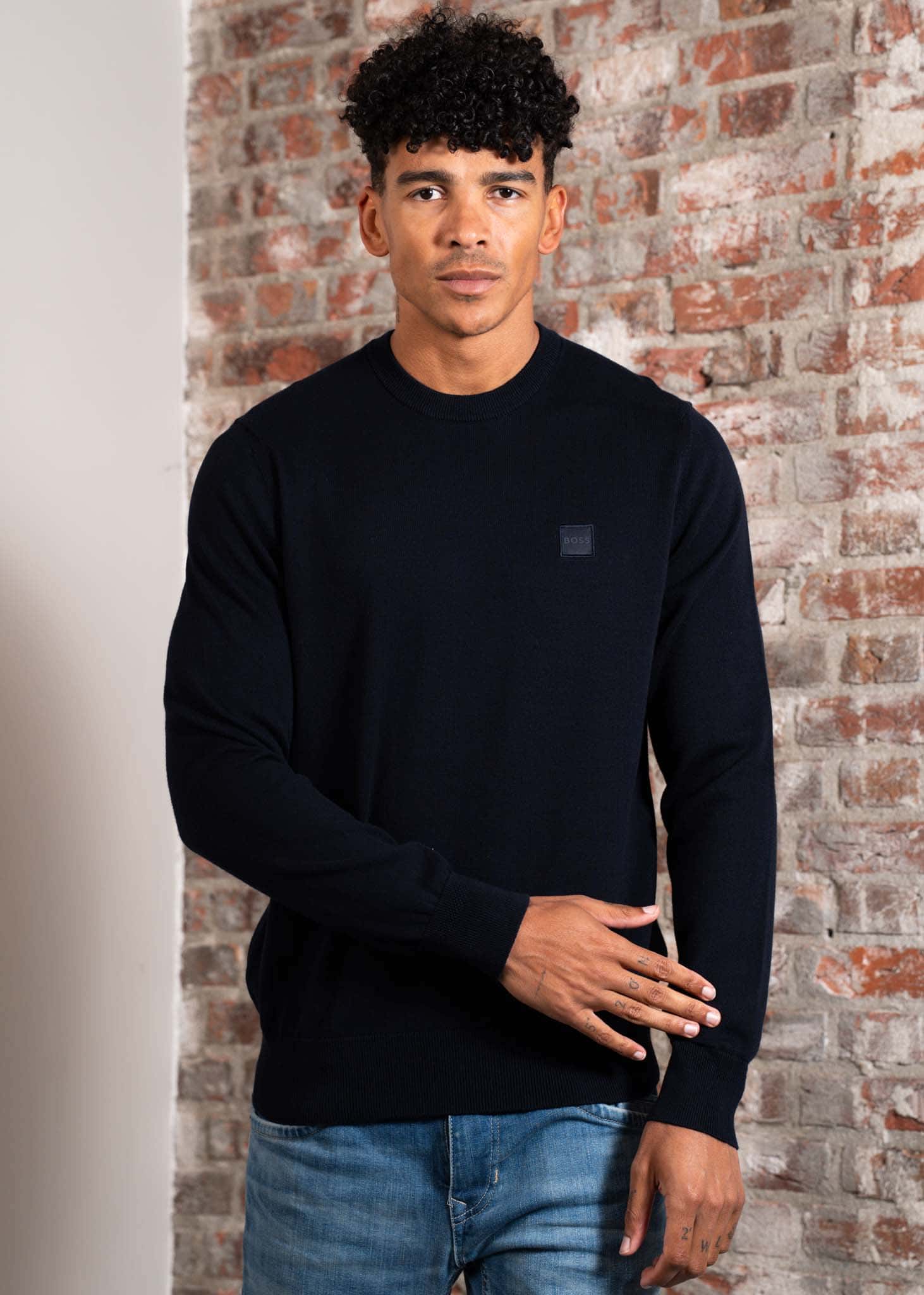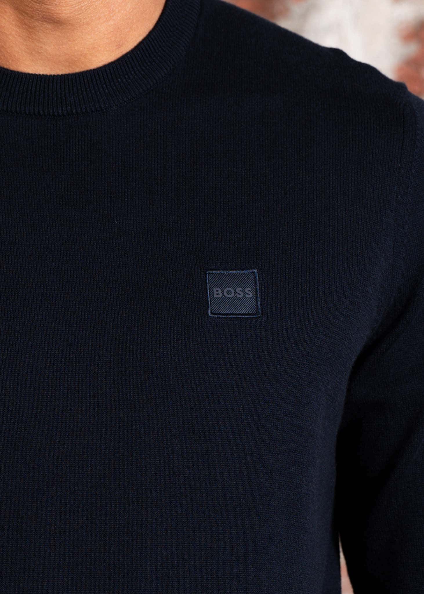 De Hugo Boss Kanovano sweater in navy is een premium trui met een tijdloos silhouet, uitgevoerd in een zachte mix van katoen en kasjmier. Deze sweater met ronde hals biedt ultiem draagcomfort en een verfijnde uitstraling, perfect voor zowel casual als meer geklede momenten.