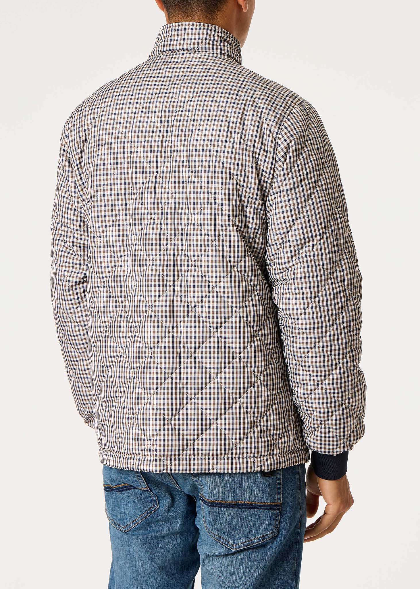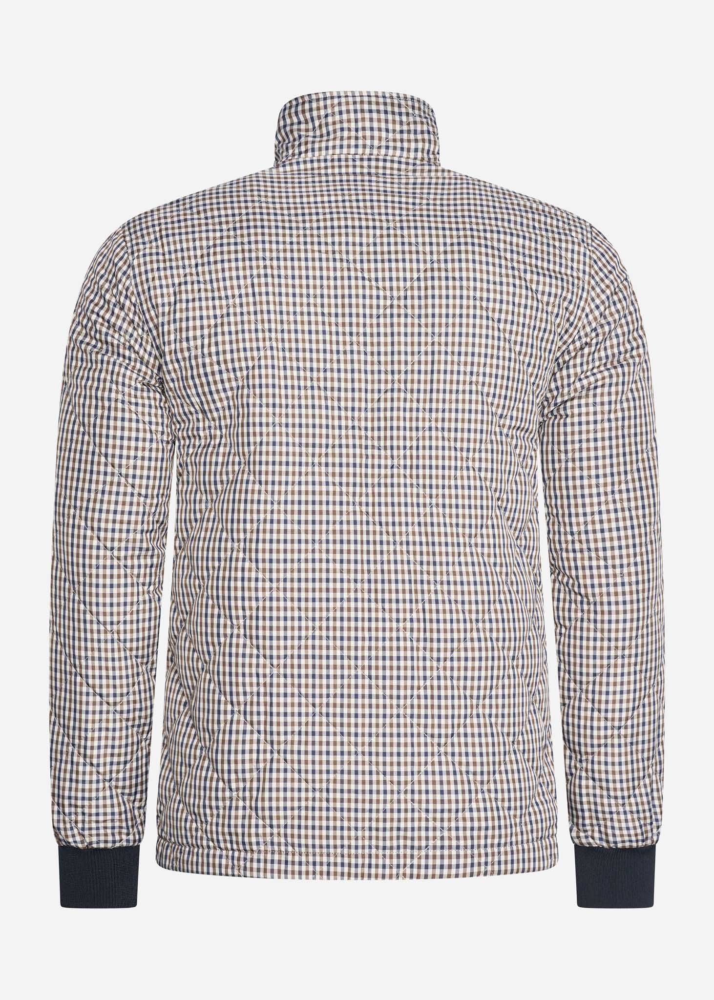 De donkerblauwe zijde is gemaakt van 100% nylon. De geruite zijde is gewatteerd. Verder zijn beide zijden voorzien van een DWR-coating, waardoor deze jas waterafstotend is.