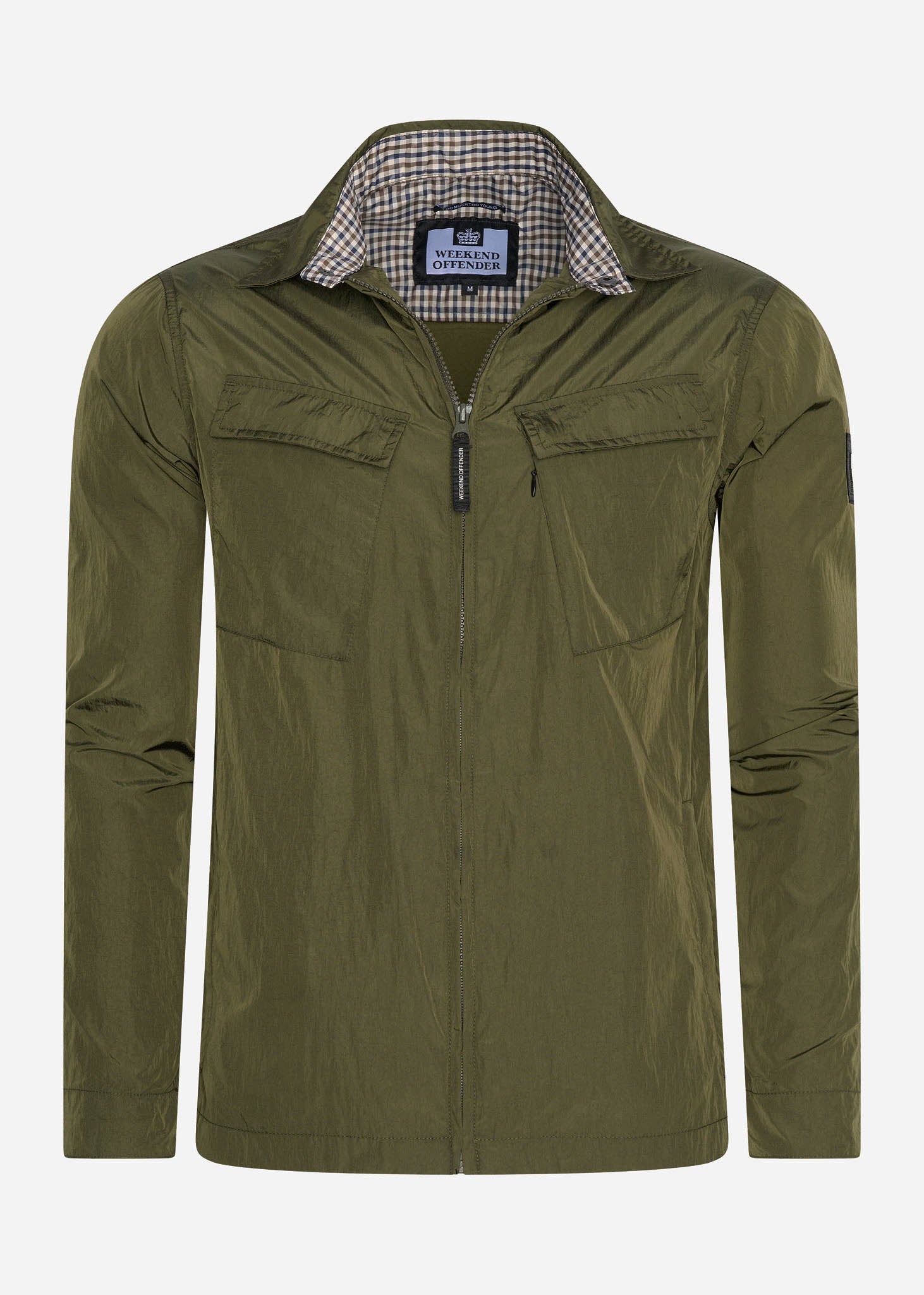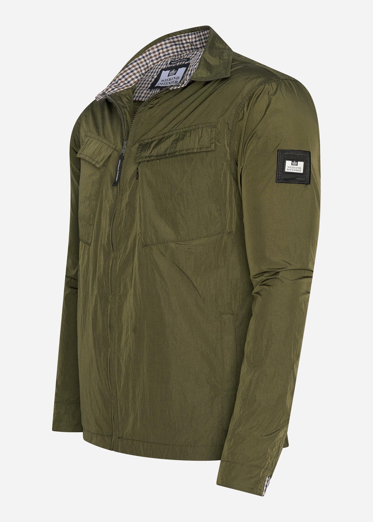 De Juniper Hills zou je zowel als een jas als overshirt kunnen omschrijven. Dit kledingstuk heeft twee zijzakken en twee borstzakken. De borstzakken zijn te sluiten met drukknopen. De manchetten zijn verstelbaar en hierop vind je een ruitdetail. Dit ruitdetail komt ook terug in de kraag. De Juniper Hills is afgewerkt met het logo van Weekend Offender op de linkermouw.