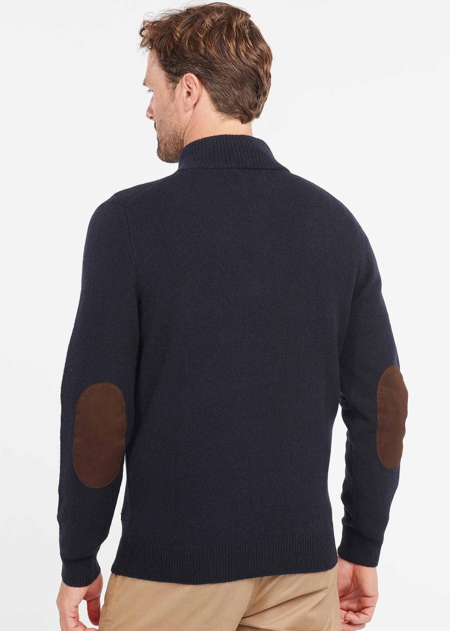 Deze lamswollen half zip van Barbour is een prachtige oldschool trui. De trui is een uitstekende aanvulling voor iedere kledingkast. De trui heeft een opstaande kraag en kan gesloten worden met vier knopen. De elleboogstukken hebben een bruine contrasterende kleur.